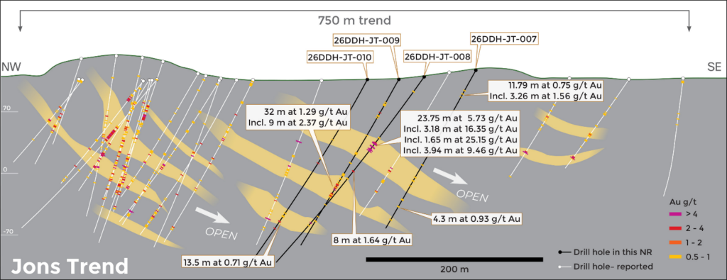 Recent drilling at Jons Trend continues to define a coherent and expanding gold system characterized by broad zones of mineralization overprinted by higher-grade intervals.